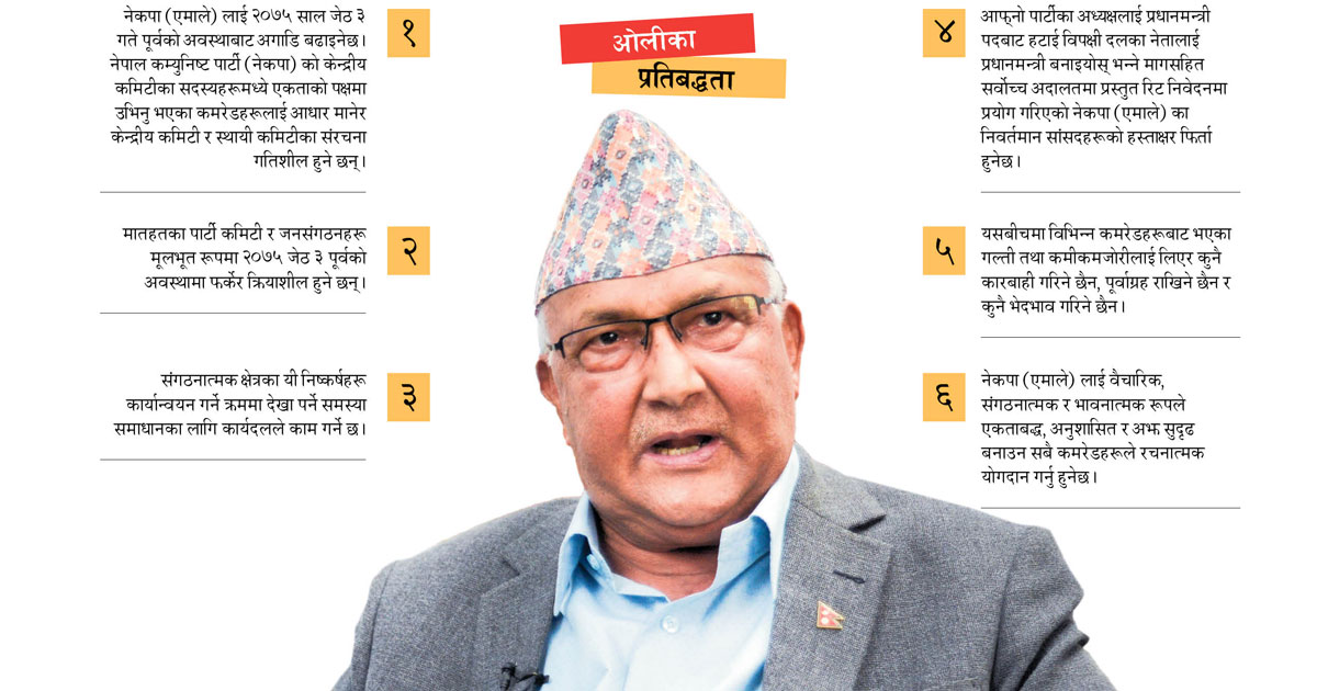 काठमाडौं : एमाले अध्यक्ष एवं प्रधानमन्त्री केपी शर्मा ओलीले आइतबार पार्टी एकताको आह्वान गरेका छन्। जसका लागि प्रधानमन्त्री ओलीले ६ बुँदे प्रस्ताव (हेर्नुहोस् प्रधानमन्त्रीका प्रतिबद्धता) अघि सारेका छन...