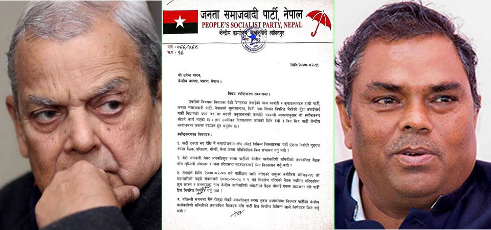काठमाडौं, जेठ १२ गते । जनता समाजवादी पार्टीका अध्यक्ष महन्थ ठाकुरले अर्का अध्यक्ष उपेन्द्र यादवसँग स्पष्टीकरण सोध्नुभएको छ । उपेन्द्र यादवले पार्टीको मूल्यमान्यता, नीति तथा विधान विपरित गतिविध गरेको भ...